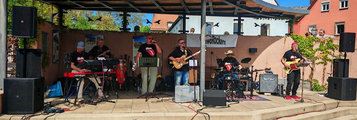 ---------------------------------------------------------------------------------------- Blues und Jazz Open 2025 AWO-Rockers begeisterten auch 2025 wieder beim Auftritt am „Jazz-Blues-Open“ Beat- und Rockmusik aus drei Jahrzehnten am Badhausplatz Wendelstein - Die „AWO-Rockers“ machten mit ihrem Auftritt am Badhausplatz im Rahmen des großen Programms der „Jazz-Blues-Open“-Tage 2025 in Wendelstein problemlos dort weiter, wo sie bei ihrer Premiere letztes Jahr aufgehört hatten: Bei bestem Auftrittswetter zum Mittanzen und Musikgenießen kamen heuer mehr als 150 Musikbegeisterte zu dem Live-Konzert am Nachmittag und wurden von den „Recken von und zu Rock‘n Roll“ mit Klassikern der Beat- und Rockära ab den 1960er Jahren bis zu moderneren Stücken der 1990er Jahre „verwöhnt“. Insgesamt knapp 400 Jahre Musikleidenschaft sind auf der Bühne versammelt, wenn die „AWO-Rockers“ als musikbegeisterte Aktive vom örtlichen AWO-Ortsverband im Alter von über 50 bis zu 76 Jahren mit lebenslanger Freude an Beat- und Rockmusik zum Konzert einladen: Diese Freude lebten die „Recken von und zu Rock‘n Roll“ auch heuer beim Konzert im Rahmenprogramm des Jazz-Blues-Open in Wendelstein begeistert vor: Vor mehr als 150 Musikfreunden aller Altersstufen boten Klaus Pusch (Bandleader, Gitarre), Reini Wagner (Vocal), Wolfgang König (Bass), Juoni Aikio (Schlagzeug), Chris Bach (Sologitarre) und Jörg Reisner (Keyboard) gern ihr Bestes. Gemeinsam mit Harry Büchs (Technik) im Hintergrund streckten die begeisterten Musiker, die in ihrer Jugend bereits in regionalen Bands spielten und immer noch gern bekannte Stücke ab der Zeit der 1960er Jahre bis in die 1990er-Jahre als „AWO-Rockers“ präsentieren, auch jetzt dem Alter sprichwörtlich „die Zunge heraus“. Ihr Konzertprogramm mit international bekannten Stücken von Beat-, Country-, Blues-, Pop- und Rock‘n Roll-Größen kam beim Publikum am Badhausplatz im Wendelsteiner Altort zudem gut an: Einige wagten neben Mitsummen, Mitsingen und Mitfeiern der Klassiker sogar ein flottes Tänzchen auf der Freifläche vor der Bühne. Musikalische Zeitreise durch drei Jahrzehnte Die knapp 30